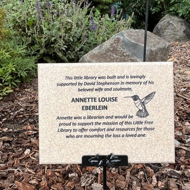 The dedication plaque at the base. Annette's spirit animal is the hummingbird and a hummingbird feeder stands behind this.
