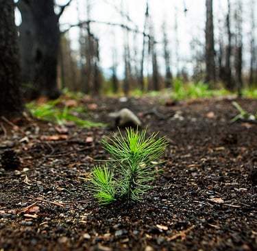 Often, seeds of many species lie dormant within the layers of a forest floor, some for quite a long time. When a fire comes through, it can create conditions in which these seeds germinate, grow and even thrive. Though the scars of the fire remain, out of devastation and tragedy, a new though somewhat different forest emerges.
